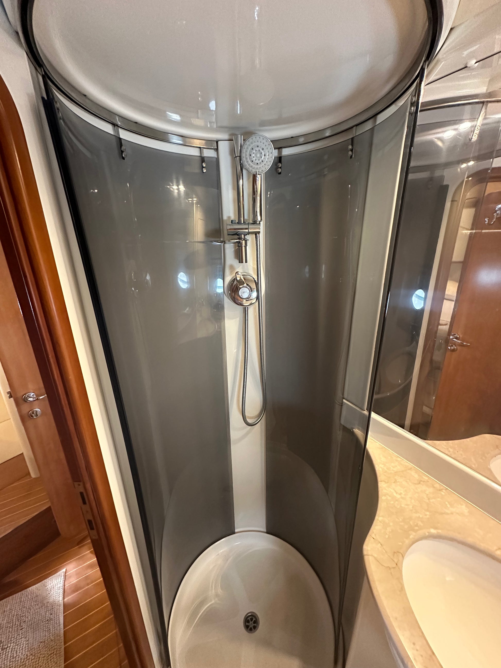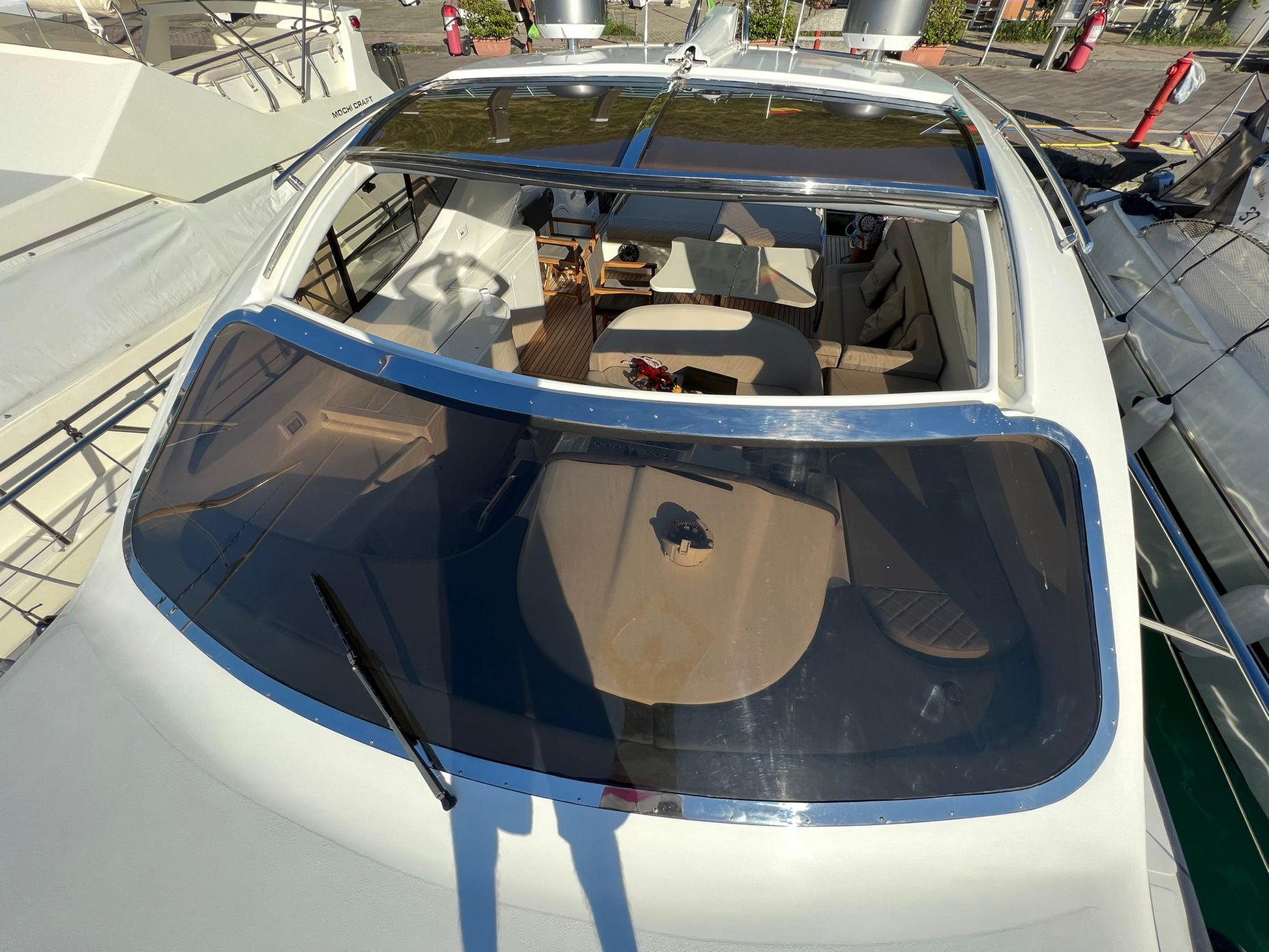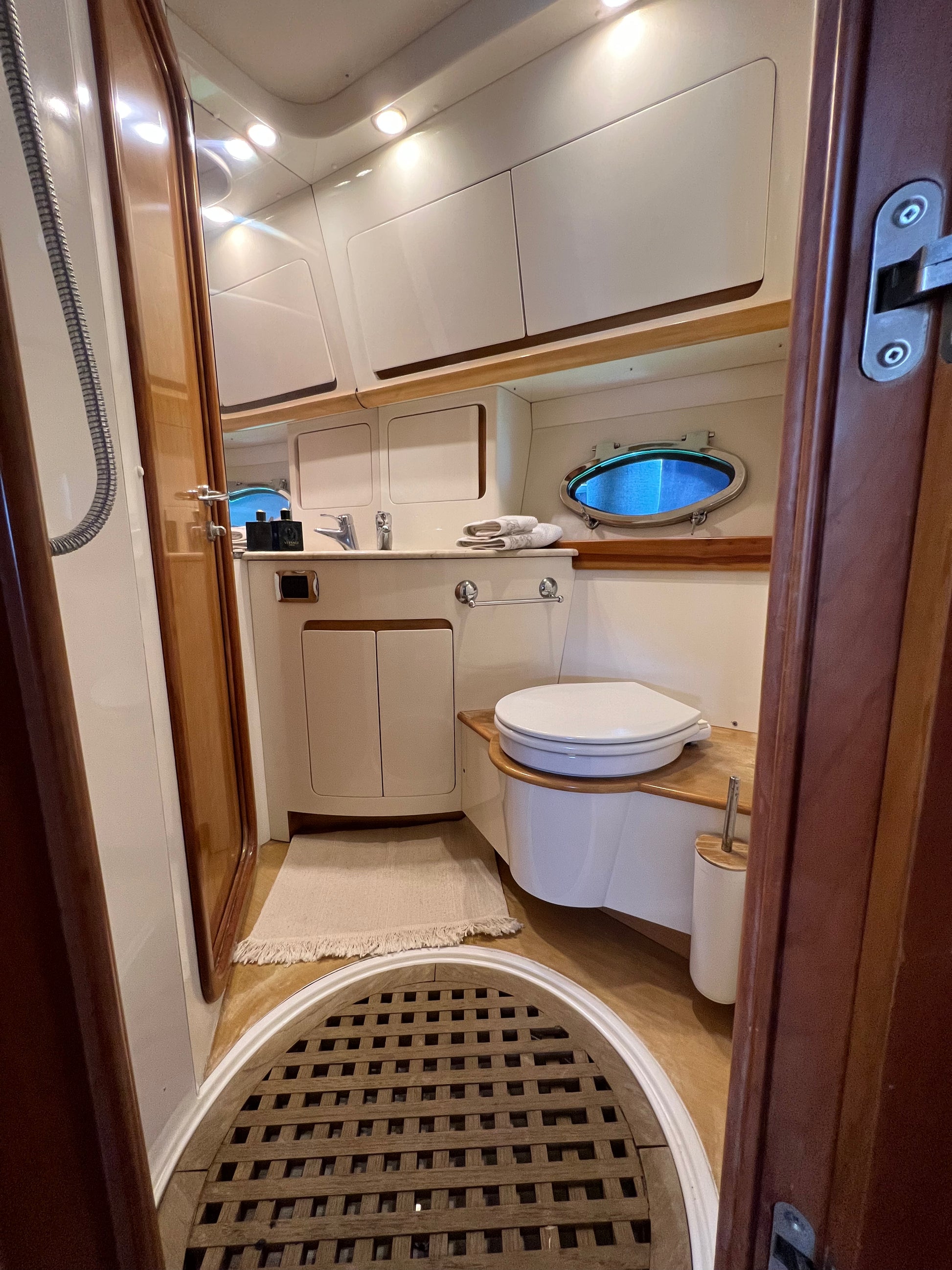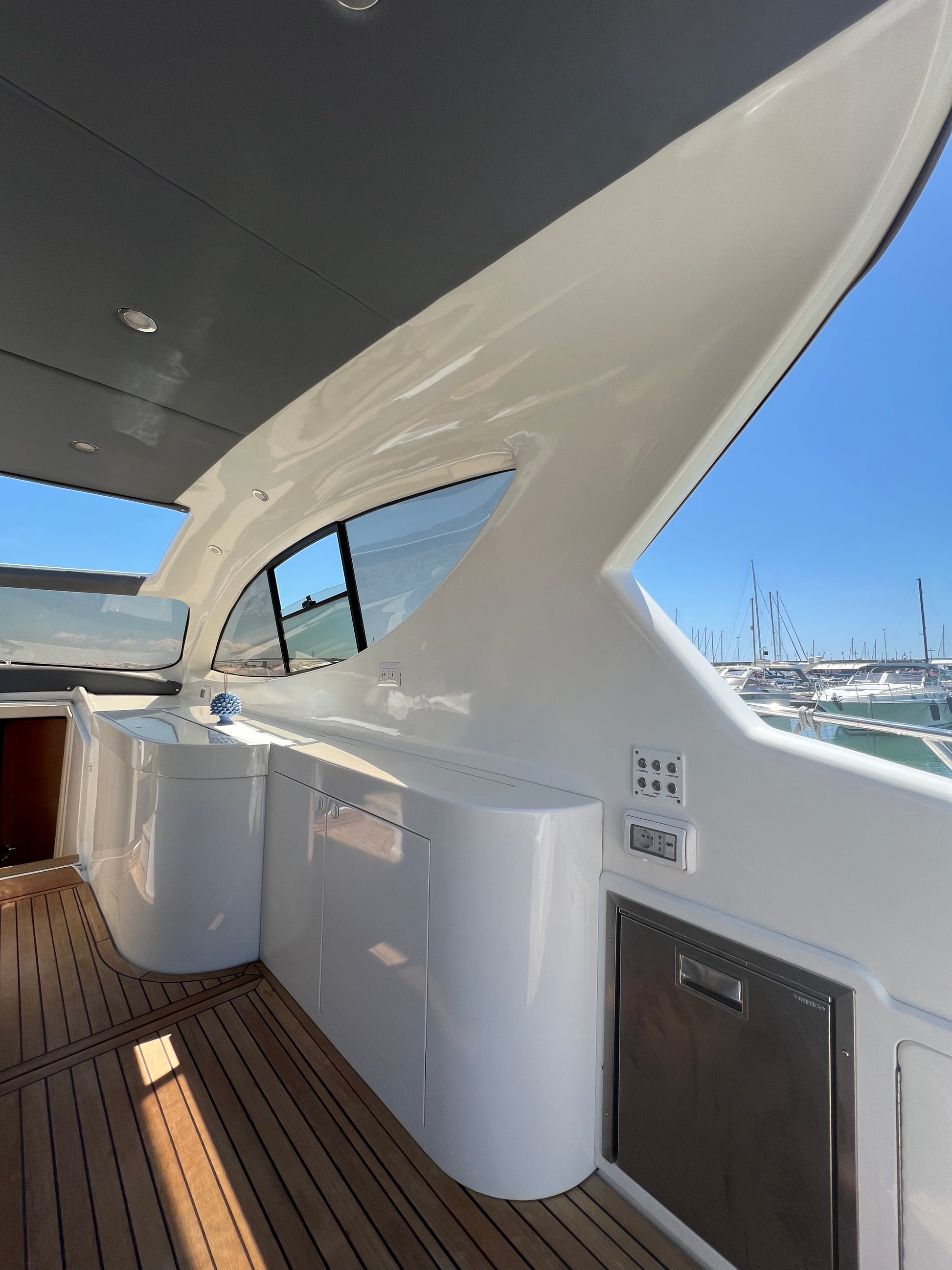 Asciugamani, impianto audio bluetooth, doccia e prendisole sia a poppa che a prua